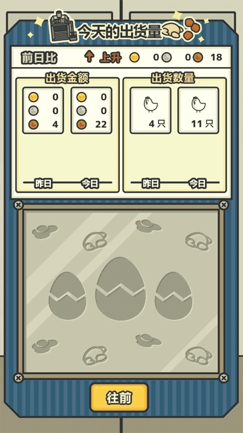 3、游戏内设有昼夜循环系统,白天是生产时段,时长三分钟。在这短暂的三分钟内,你只需点击一次,就能让机器工作时间缩短10秒,促使小鸡更快成长,进而更快售出以赚取更多收益。此外,你还能将价格低廉的鸡放生,让昂贵的鸡种进入鸡栏产蛋。三分钟结束后,会弹出营业报告,详细告知你总共卖出了多少只鸡以及盈利金额,并且会与昨日数据进行对比,相当励志。