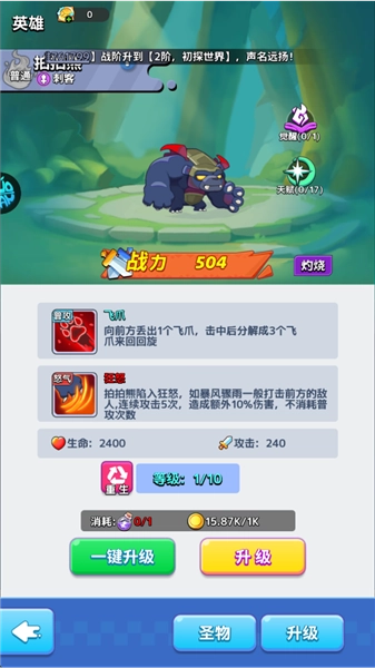 怒气技能:【狂怒】拍拍熊瞬间陷入狂怒状态,以暴风骤雨之势对前方敌人展开攻击,会连续发动5次攻击,每次攻击都将造成额外10%的伤害,且该攻击不占用普通攻击的次数。