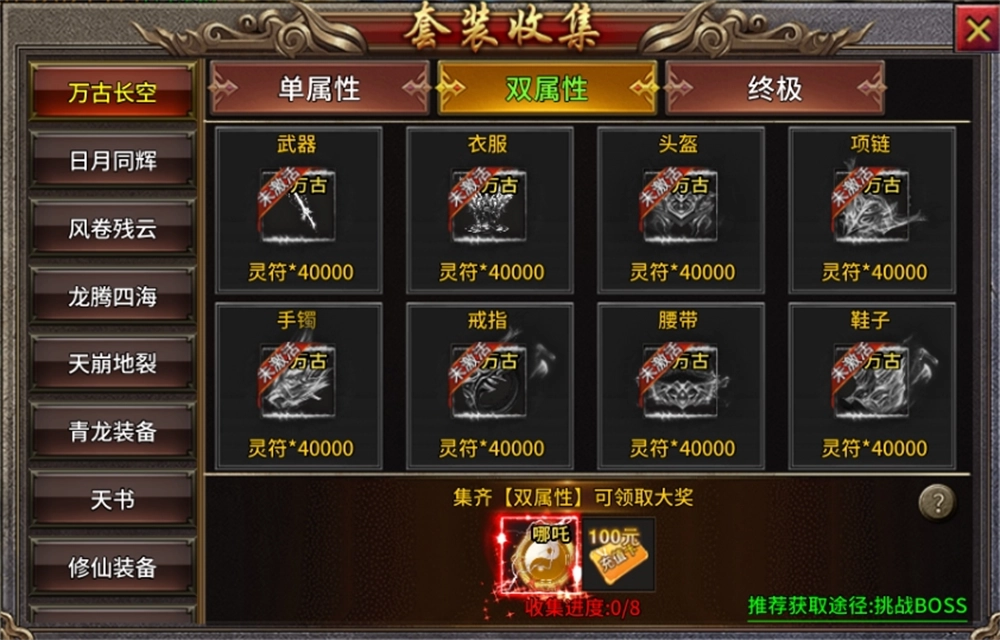 在打怪升级的过程中同步收集套装,一旦成功集齐套装,就能获取充值卡、专属装备以及神技等各类奖励。