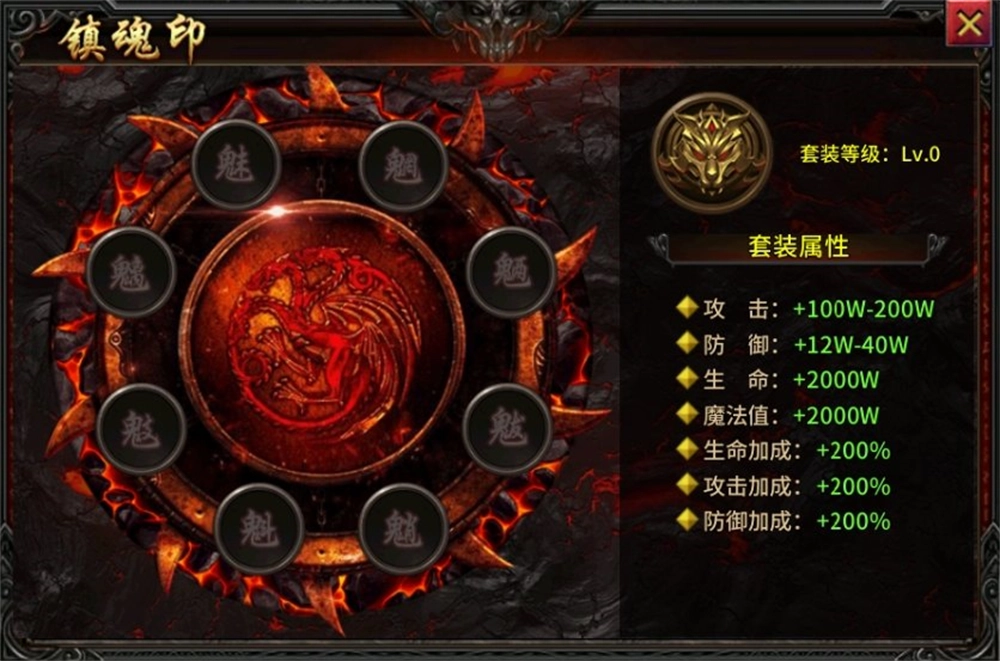 击败魔界地图【森罗鬼域】中的怪物,就能获取镇魂印。集齐并装备一整套镇魂印,便可激活额外的套装属性。