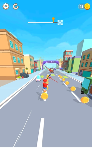 2. 当碰到前方车辆时,点击屏幕,角色便会抛出绳索勾住车顶,进而触发加速效果,向前冲刺。