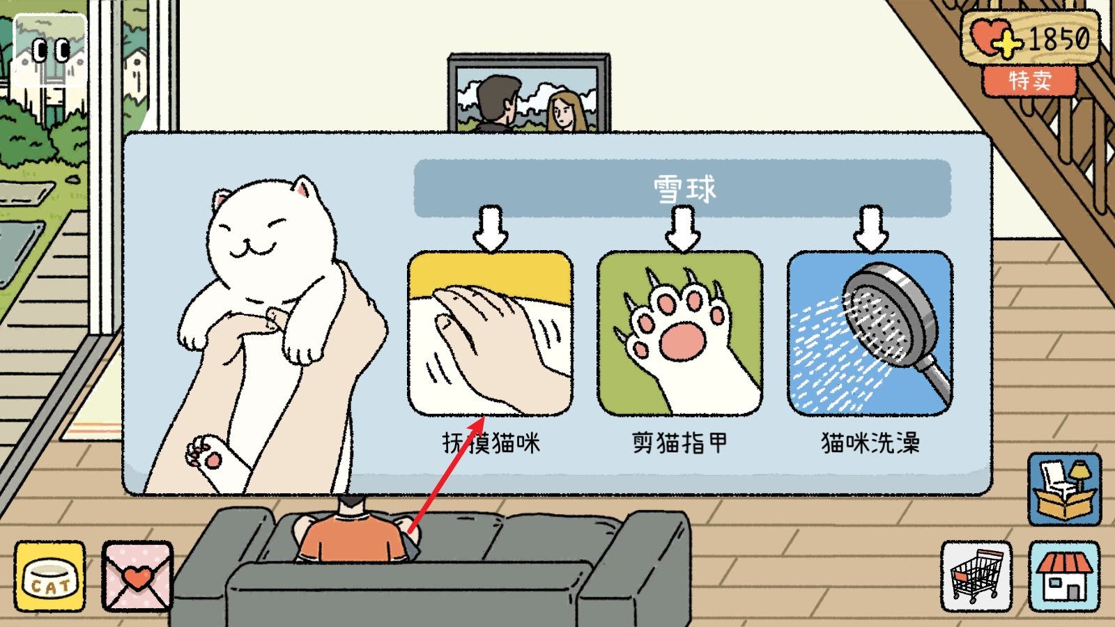 3、接着可以选择合适的方法去逗猫,例如这里选择了抚摸。