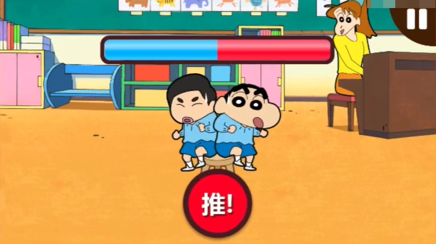 6、来到最后一轮后,就会有所不同,我们需要和最后一个同学进行对抗,不断的点击推,当代表我们颜色的进度条满了之后,我们就能够抢到板凳,获得最终的胜利。