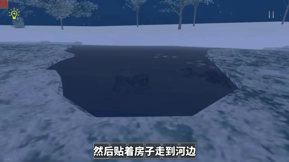 4、贴着房子走,来到湖边,然后找到没有冰面的地方跳下去即可解锁。