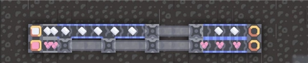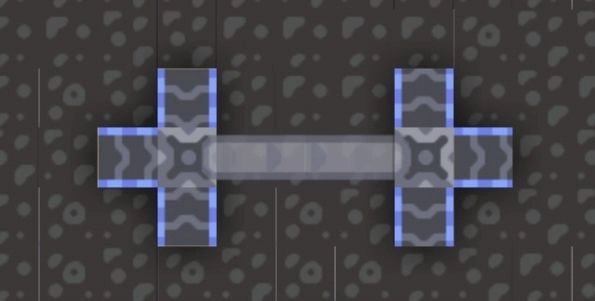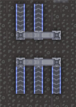 注意B不接受带输入,A也不接受桥下的带输入,所以在输出资源时,往往需要多安置一个传送桥单体,让最外面(上图为最上面的一排钻头,共四个)的钻头也能正常输出。