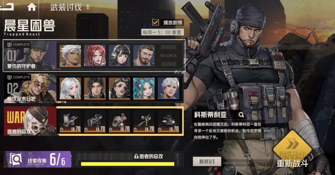 每周一5:00进行重置,重置后,已通关关卡可通过“突入战斗”进行扫荡。