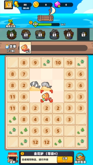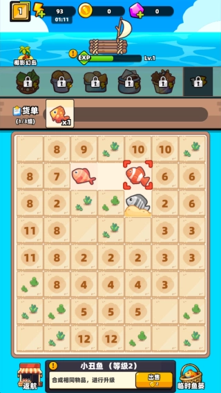 3、捕捞过程中点击收集小鱼,将相同等级的鱼类移动合成升级,解锁稀有品种,逐步完成货单要求。