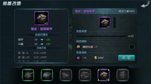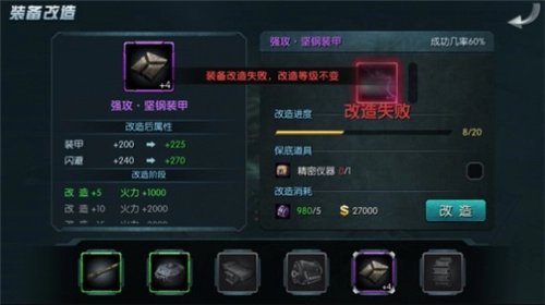 装备改造时,成功率是随着改造等级的提升而降低的,因此会发生失败的概率,并且失败后有可能会造成改造等级下降。对于高改造等级装备的再次改造,我们建议玩家使用改造的保底道具——精密仪器,它可以确保改造失败后改造等级不降低。精密仪器在商城有售,同时完成每日任务的玩家可以从奖励中获得。