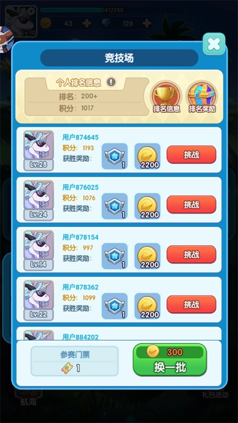 2、竞技场获胜:开蛋过程中除了可以获取金币,还会随机掉落竞技场挑战券。拿上挑战券,就可以和其它训练家进行pk!取胜后可以获得金币和积分奖励,随着积分的提高,你的对手会变得更强大,金币奖励也会更加丰厚!风浪越大~鱼越贵~想必就是这个道理了!