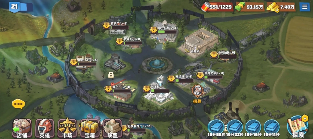 城市:能够限制员工、英雄的等级上限,需要用钱来升级。、
