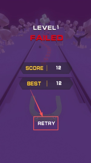 4、失败重试:当出现“LEVEL1 FAILED SCORE 12 BEST 12”的提示时,点击“RETRY”按钮可重新发起挑战。