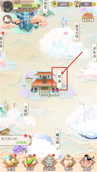 当处于【2级-初出茅庐】阶段时,点击界面中的【招募】按钮,即可进入该功能界面,为获取灵兽资源做准备。