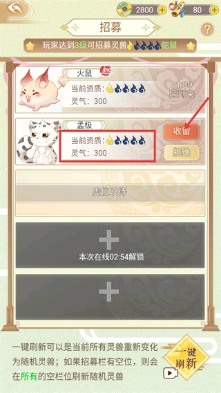 2、进入招募界面后,找到【孟极-当前资质:四星-灵气:300】的属性信息,点击【收留】按钮即可获得这只灵兽。