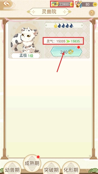 3、进入灵兽院界面后,消耗【240】份对应资源来提升【孟极】1级的灵气,让它的灵气值增长到【15835】。