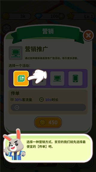 浴场既然已经建成,自然是要吸引顾客的。所以我们得挑选适合自己的营销手段来招揽客源。初期资金有限时,只能选用成本最低的【传单】,等后续发展起来,大家就能自由选择其他方式了。