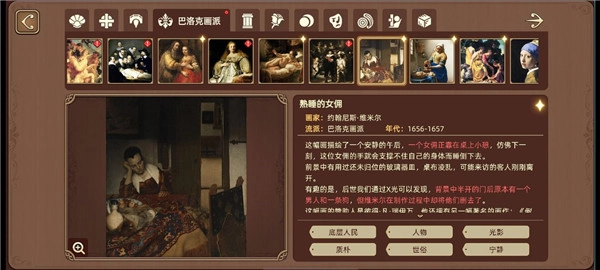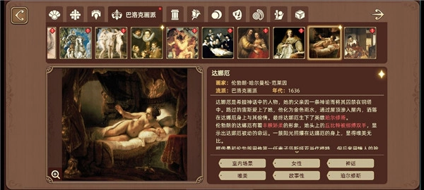 2、品味绘画艺术的魅力,除了通过关卡挑战的消除玩法外,游戏的另一核心玩法是鉴赏收集到的世界名画。每一幅收集到的世界名画,玩家都能为其添加标签。这其中,除了性别等明显标签外,其他标签内容需要玩家在游戏里尽可能多地搜集各类资料、梳理相关文献信息,最终完成对每幅画作的完整解读,真正领略绘画艺术的美妙。