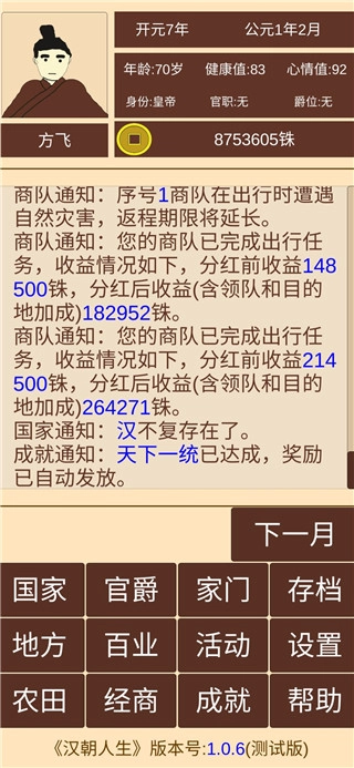 汉朝作为继秦朝之后的大一统王朝,不仅沿袭轻徭薄赋,还让天下安平、百姓殷富,并开创“明章之治”,如果你也想体验下当时的人民种田或经商,亦或是体验皇帝人生,那么不妨来试试汉朝人生游戏,这是一款文字模拟主题的游戏,游戏采用文字叙述玩法,在这里玩家可以体验全新的不同的人生。同时汉朝人生游戏提供了独特的模拟趣味以及玩法,当你独自生活在汉朝的时候,你将会作出什么样的选择以及结局?是在自立后处理内政事务,体验皇帝人生,还是复刻汉武帝时期为筹措军费的爵位买卖,亦或是通过购买更多的农田积攒财富,等等玩法都可以体验。除此之外,在汉朝人生最新版中还新增了多种功能,如、罢免官员、一键购置农田、一键卖出粮食、一键调整建设方针、一键加深地方关系等多种功能,旨在为玩家带来更好的游戏体验感!喜欢模拟类型和汉朝文化的玩家可以不要错过这款游戏哦!