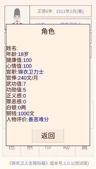 在这里你可以直观的了解角色属性,包括名字、年龄,以及其他重要的基础数值健康值、心情值、官职、管俸、武功值和功勋值。其中武功值和功勋值,对于官职晋升有着重要作用。
