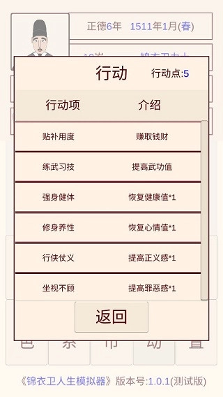 通过选择行动项来获取武功值、健康值、正义感、心情值等基础属性。