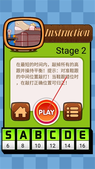 1、进入【Stage-2】界面后,按照提示对准鞋跟中间位置进行敲打以维持平衡,随后点击【PLAY】按钮开启关卡挑战。