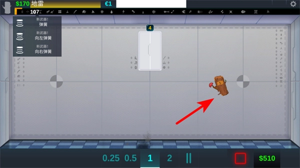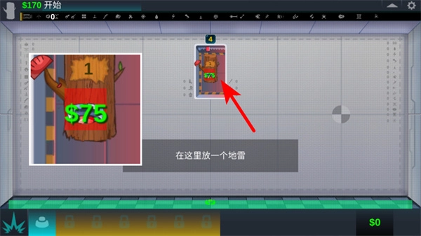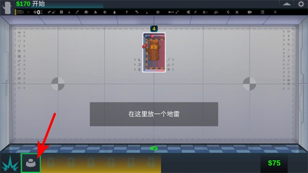2、进入布置阶段后,点击下方道具栏里的地雷选项,把它放置到指定区域,合理运用道具来完成测试任务,与此同时要留意当前的资金数值。