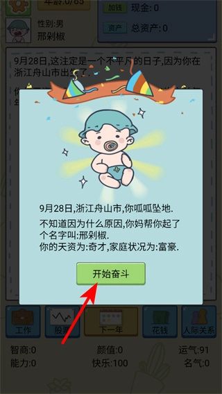 1、在初始界面确认自身的天资与家庭状况后,点击开始奋斗按钮进入人生流程,这是开启人生模拟的核心步骤,后续可通过每年的选择积累属性。