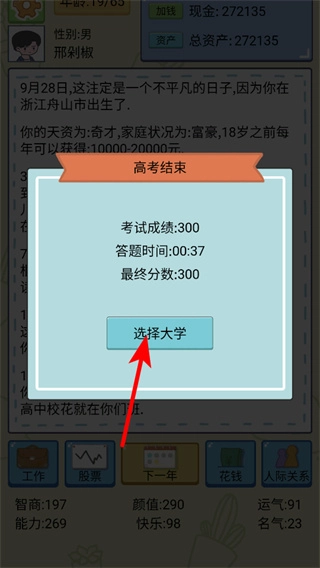 4、高考结束后,点击选择大学按钮进入学业阶段,结合前期积累的属性如智力、名气选择适配的院校,为后续的职业发展奠定基础。
