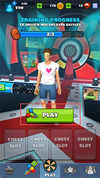 1、启动飞镖俱乐部游戏,点击【PLAY】按钮进入游戏,接着就能开启挑战环节。