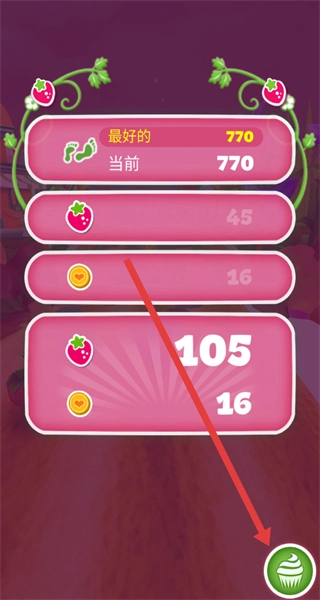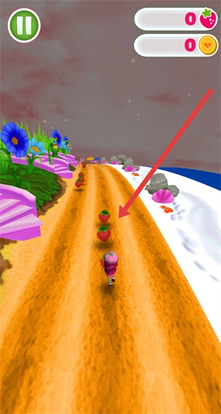 1、在跑酷场景里操控角色移动,收集路上的食材,比如草莓。