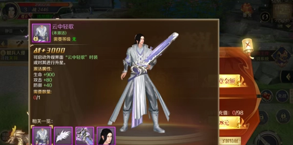 2、累充98元档:可以拿- -个紫色外观 首冲礼包送的礼品性价比还是不错的,前期建议入手。