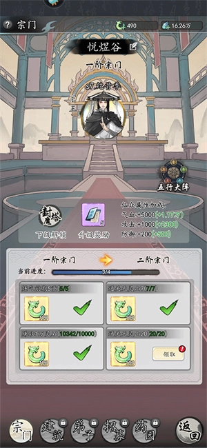 5、宗门大殿:宗门大殿里建筑有灵石塔(产出灵石,小几率得功法令),神木殿(产出月华神木,小几率产出寻仙令),仙药圃(产出玄灵根,小几率产出红色弟子招募令)。优先扩充顺序为:仙药圃>神木殿>灵石塔。仙药圃很重要,这里是玄灵根大量稳定产出的地方,等级越高产出越高。目前这个宗门大殿等级只开放到10级,这三个建筑最高也只能升到10级,10级每个里面可放10个弟子生产。提升宗门大殿等级可以提升弟子可拥有数量,10级为可拥有33个。赶紧招募红弟子放进去生产吧!建筑生产可存储12小时,每天晚上睡前记得点击领取。