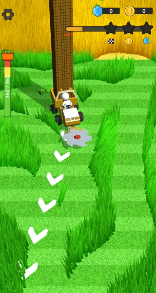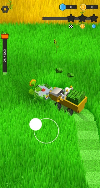 2、在割草的过程里,借助屏幕上的虚拟摇杆来控制割草车的移动走向,灵活地调整它的位置,使锯片能够覆盖到更多有杂草的区域。