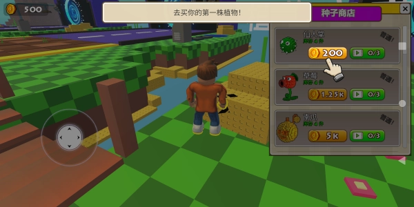 进入游戏后,玩家可依据画面上方的任务指引开展行动,当前需操控角色前往商店购置植物。