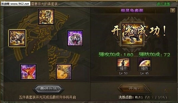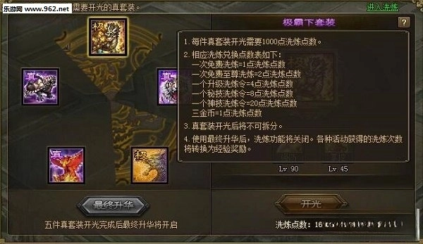 简而言之,每个真套装想要升华为极套装,每件需要1000洗练点开光,开启最终升华需要五件极套,共计5000洗练点。
