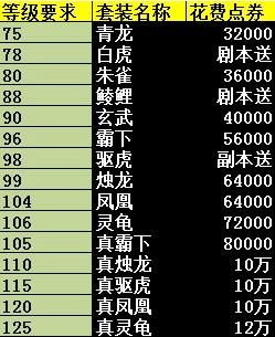 ①青龙:纯血量套装,作战能力不强,但后期合成真烛龙套装对于副本效果相当不错,也有人攻城穿青龙刷影子经验更高。
