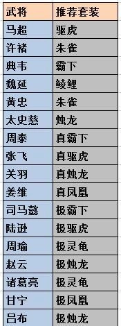 ③朱雀:战法输出神器,可以赋予武将最高战法输出的套装,适用于勇高的四排战法的武将,如甘宁、黄忠等。副本和攻城效果都很不错。