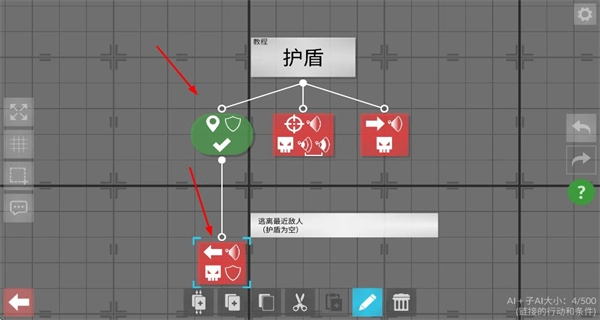 1、在指令编辑界面中,把护盾功能和触发条件相关联,完成机甲防御指令的配置,以此提升作战时的生存能力。
