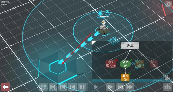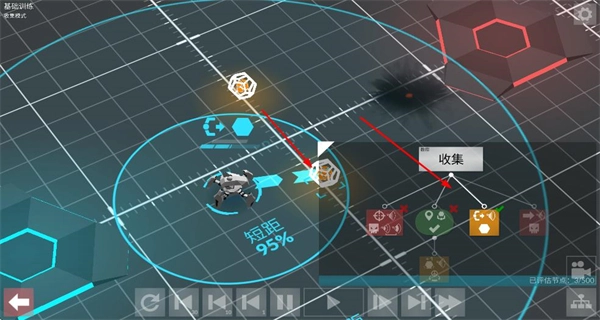 3、点击收集指令,操控机甲朝着资源道具移动,在靠近资源道具后完成拾取操作,以此获取战场上的增益资源。