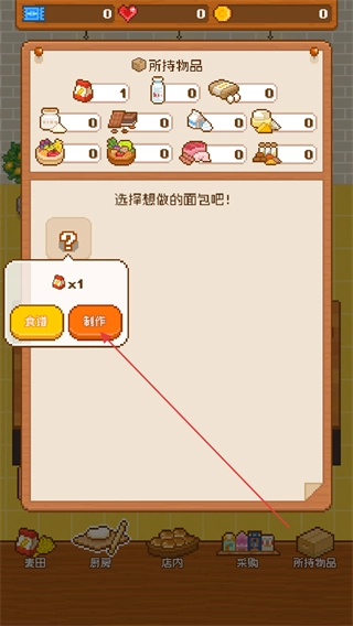 进入界面后,可查看所持物品;在“想做的面包”区域点击制作按钮,即可启动面包制作流程。