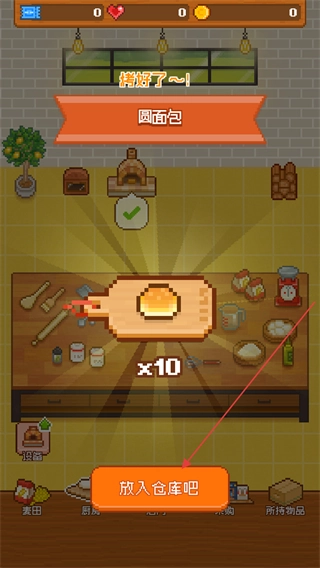 4、目前圆面包的已烤制完成数量是×10,点击界面上的“放入仓库吧”按钮,就能把这些面包存进库房了。