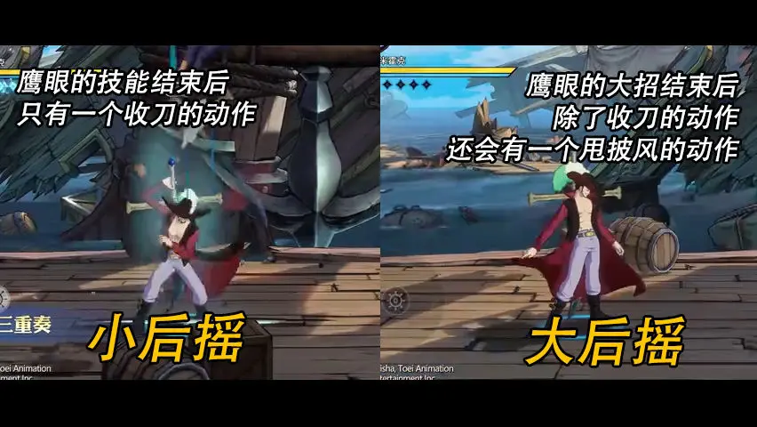 和前摇类似,索隆朝着敌人挥刀砍去,造成伤害后,通常会摆出一个超帅的pose,之后还得从这个pose变回原来的姿势,这个阶段同样属于“活靶子”时期,这一时期就叫做“后摇” 。