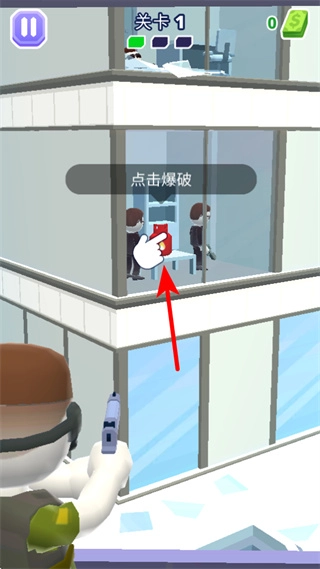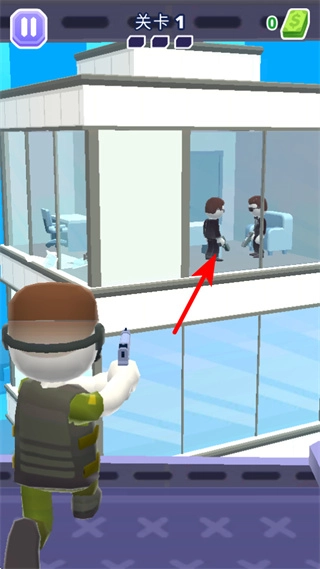 1、进入关卡后,点击目标敌人如室内的黑衣人触发射击操作,这是清除敌人的基础方式,可快速完成单个敌人的消灭。