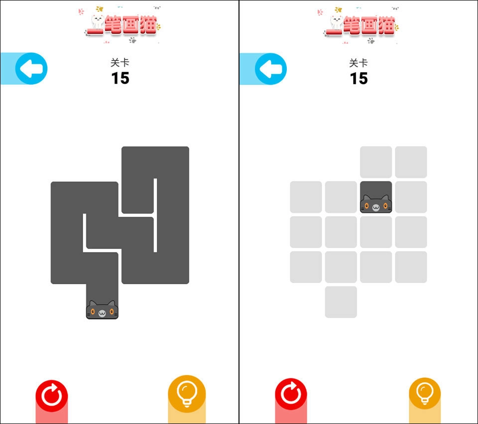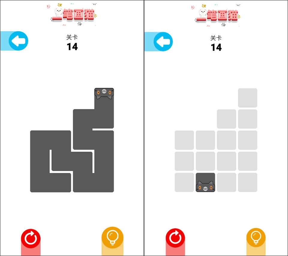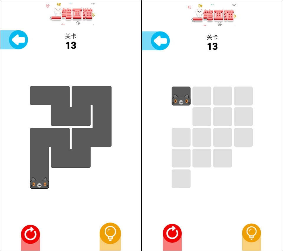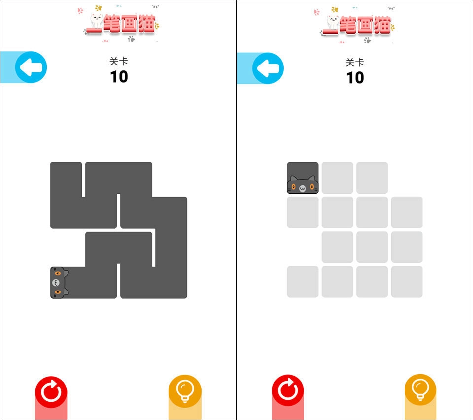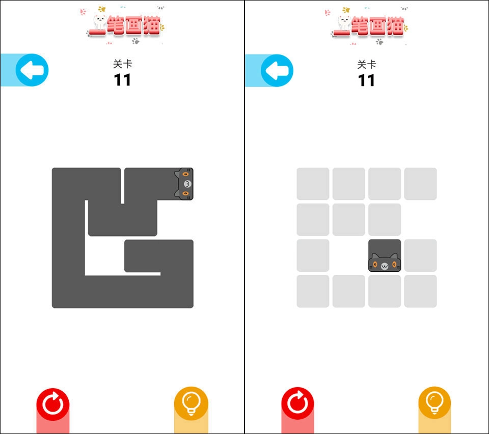 一笔画猫是一款休闲闯关游戏,玩家的任务是引导猫咪通关。操作方式是拖拽猫猫头,在网格上画出连续的路径,规则是必须经过所有灰色格子,同时不能重复经过同一个位置。这款游戏把经典的一笔画玩法和萌系的画风结合起来,关卡从简单的十字网格开始,逐步过渡到复杂的多区域地图,两千个关卡由易到难,能逐步锻炼玩家的逻辑思维能力。