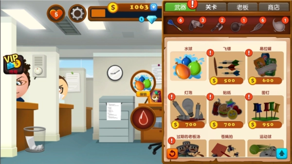 3、借助道具折磨老板能获取金币,再用金币解锁更多趣味道具。