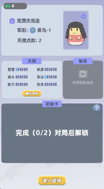 1、能够随机生成人物属性,点击下方的“进入战场”按钮即可开始游戏。
