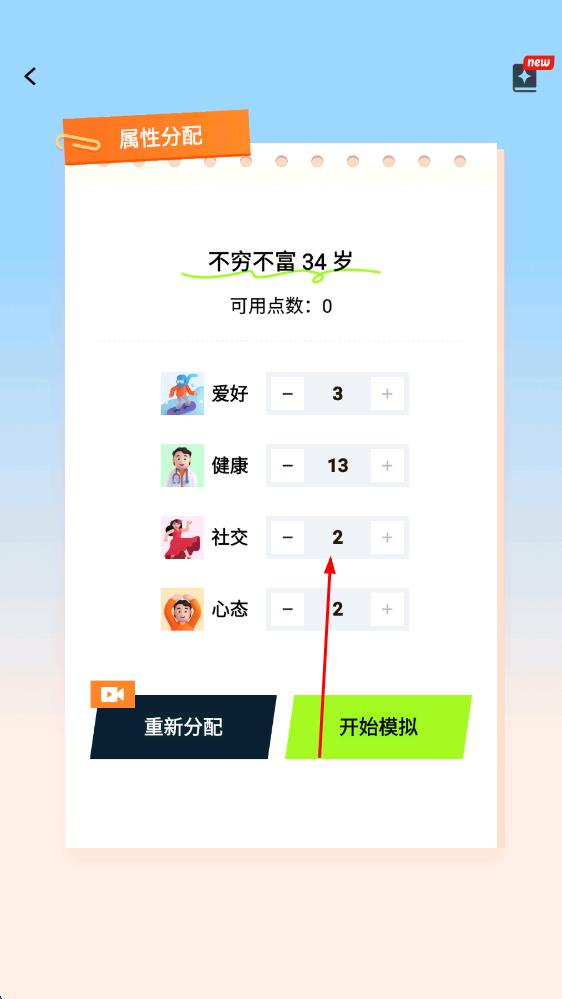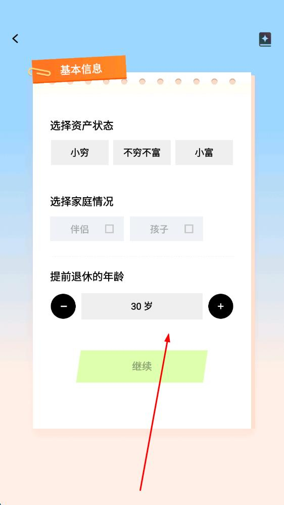 1、第一次进入游戏时,点击“第1轮模拟”,先设置自己的基础信息,比如资产情况、是否有家人陪伴,还有希望开始提前退休生活的年龄等,为之后的模拟过程打好基础。
