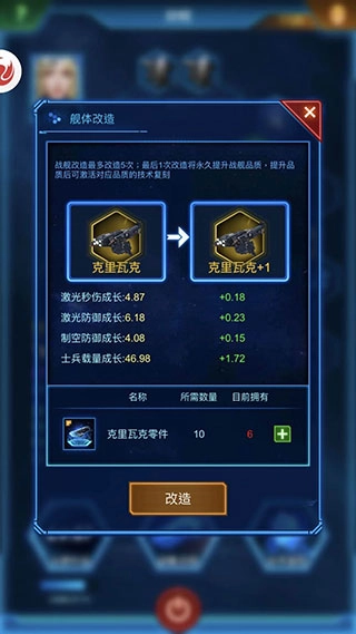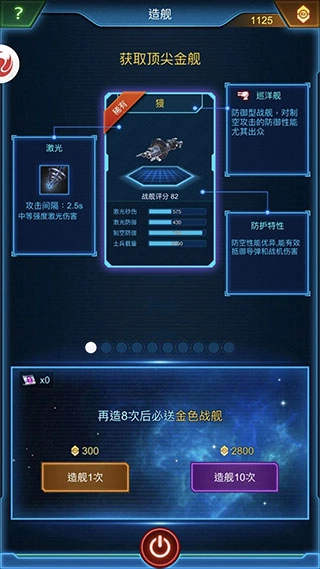 战舰资质:普通玩家有金色战舰就是最好的,游戏时间长了自然也能拿到红色的战舰,平时的话咱们只要想办法多拿金舰。第一个方法就是扫荡叛军获得机体组件,使用机体组件直接兑换关卡中的金舰。第二个方法是氪晶造舰这里,每10次一定可以获得一个金舰,相当于20天一艘,还是很快的。