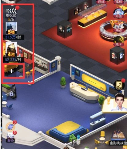 拍完之后总得想办法赚钱吧,左边的「版权部」可以看看有没有空位。要是有空位,系统会自动把刚拍完的片子放进去销售;要是没有空位,你可以挑选一部收益比较低的删掉,然后点击+号让刚拍的电影上映。