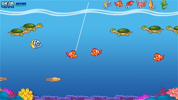 5、钓鱼方法很简单,我们只要点击屏幕,上方的鱼线就会向下延长,当鱼线顶端刚好碰到鱼,就能将它吊起来了。这个大家多尝试几次就可以轻松钓到鱼;