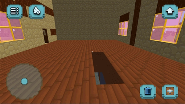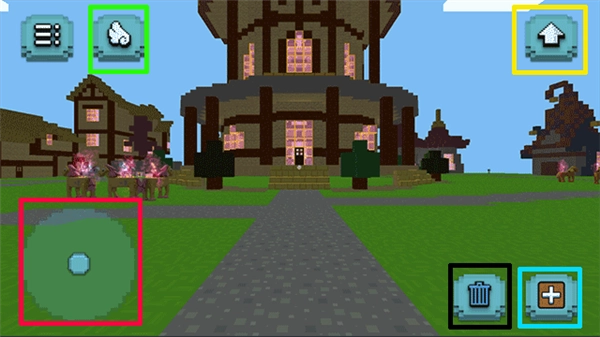 3、玩家可通过左侧红色方框内的方向键实现移动;为便于大家更出色地设计房屋,游戏里绿色方框内的选项能帮助切换飞行或走路状态,蓝色方框内的选项可用于添加方块,黑色方框内的选项能助力删除方块,黄色方框内的选项则能辅助大家完成跳跃动作。